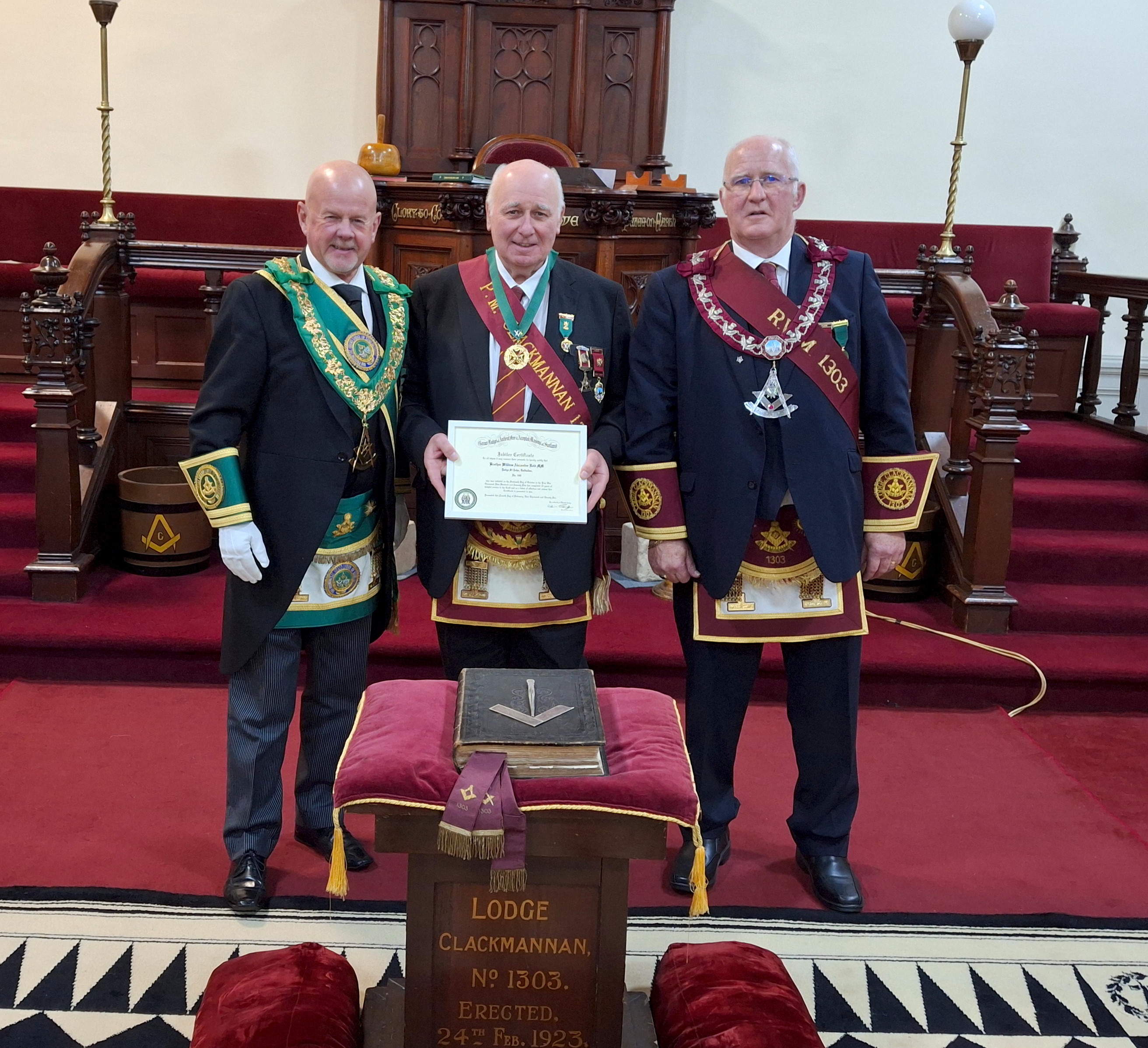 At their Regular meeting on Wednesday 4th February 2026, the Right Worshipful Master of Lodge Clackmannan No 1303 Brother Brian Aitken presented Brother William Reid PM with a diploma to mark his 50 year membership of the craft.
